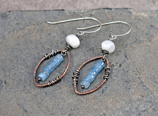 Aquamarine and Moonstone Mixed Metal Earrings, Artisan Copper and Sterling Silver Handmade Jewelry
