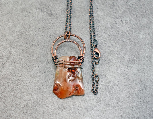Cherry Blossom Agate Necklace, Hammered Copper Wire Pendant, Rustic Earthy Stone Jewelry