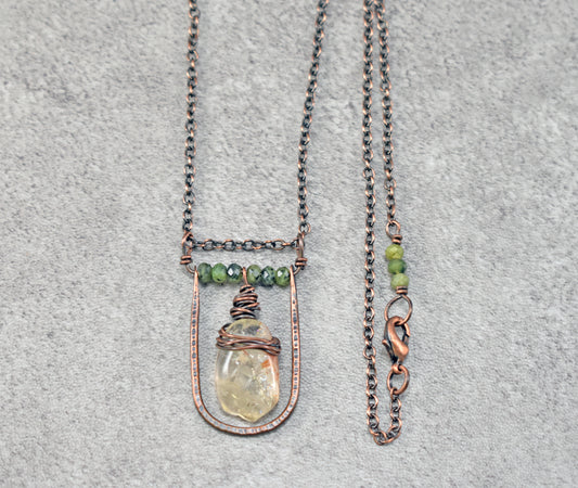 Citrine, Jade and Copper Necklace, Natural Yellow and Green Stone Pendant, Unique Handmade Jewelry