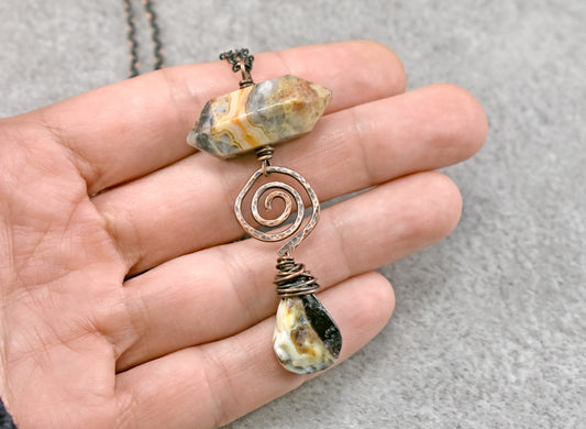 Crazy Lace Agate and Rutilated Quartz Necklace, Hammered Copper Wire Spiral Pendant, Rustic Gemstone Jewelry