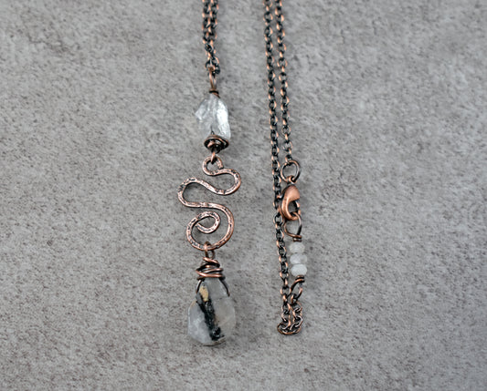 Rutilated Quartz Crystal Pendant, Long Copper Wire Artisan Necklace