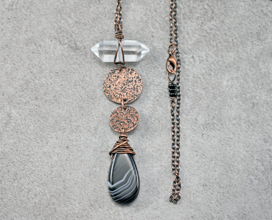 Long Black Sardonyx and Quartz Point Copper Necklace, Rustic Handmade Jewelry