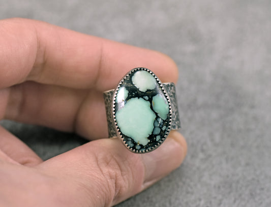 Variscite and Sterling Silver Wide Band Statement Ring, Size 9, Rustic Silversmith Handmade Jewelry
