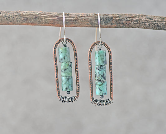African Turquoise Jasper and Copper Earrings, Blue Green Gemstone Rustic Mixed Metal Jewelry