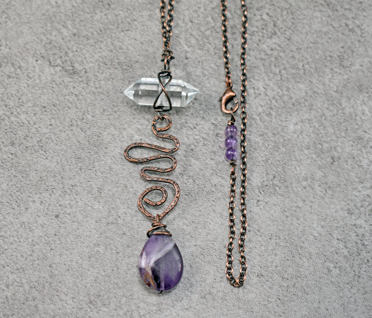 Amethyst Teardrop and Quartz Point Necklace, Rustic Handmade Copper Jewelry