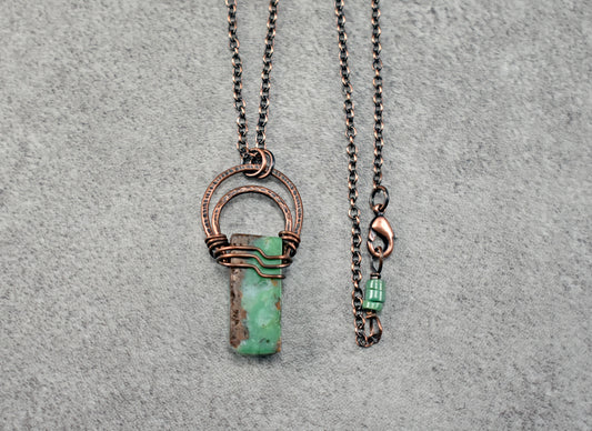 Chrysoprase and Copper Necklace, Natural Green Stone Pendant, Rustic Handmade Jewelry