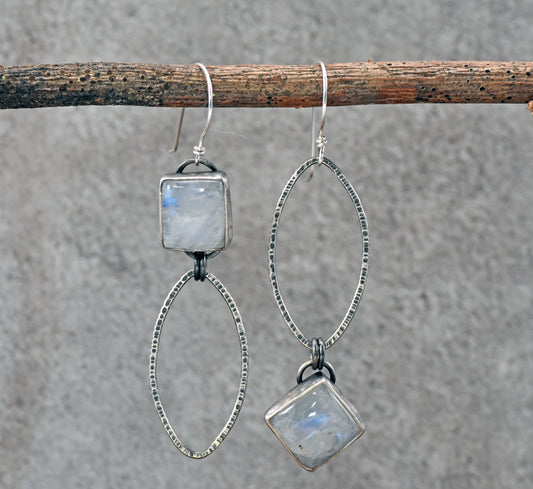 Rainbow Moonstone and Sterling Silver Statement Dangle Earrings, Artisan Silversmith Jewelry