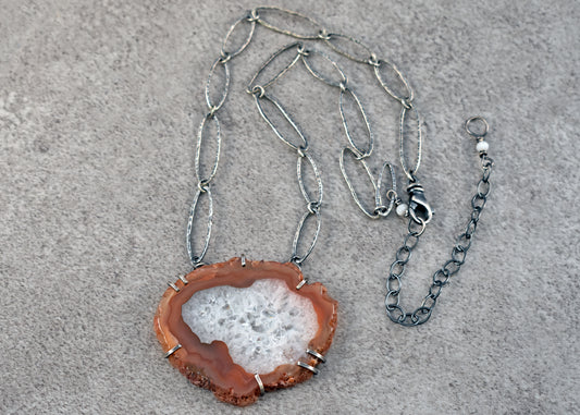 Agate Slice and Sterling Silver Prong-Set Necklace, Orange and White Stone with Handmade Chain