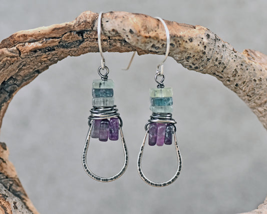 Fluorite and Sterling Silver Dangle Earrings, Green and Purple Gemstone Jewelry