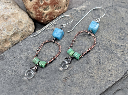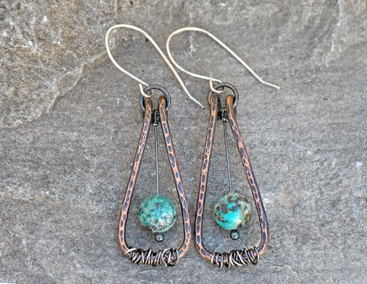African Turquoise Jasper and Copper Earrings, Blue Green Gemstone Rustic Mixed Metal Jewelry