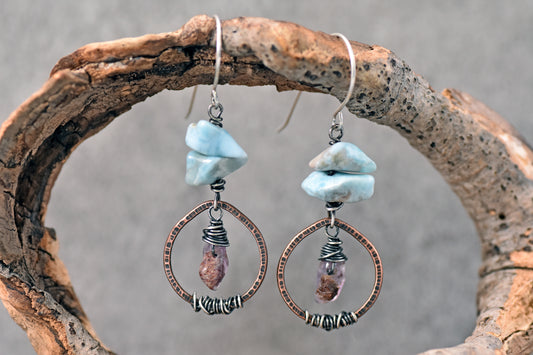 Larimar and Super Seven Mixed Metal Earrings, Artisan Copper and Sterling Silver Handmade Jewelry