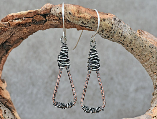 Mixed Metal Copper Sterling Silver Earrings, Rustic Artisan Messy Wire Wrap Jewelry Handmade