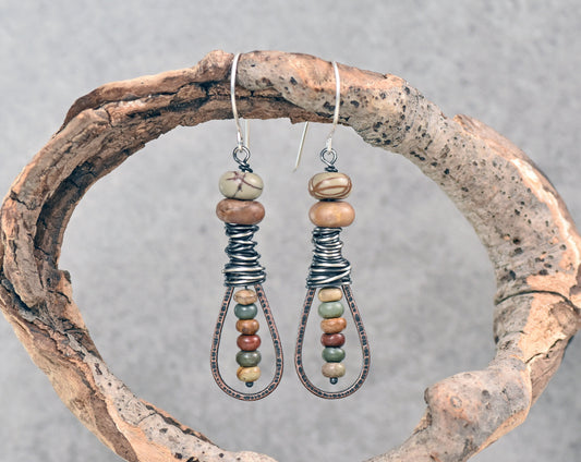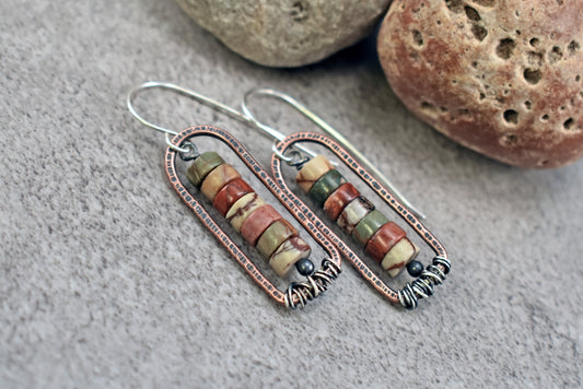 Red Creek Jasper Earrings, Natural Earthy Stone Dangles, Rustic Copper Jewelry, Fall Color, Mixed Metal, Sterling Silver
