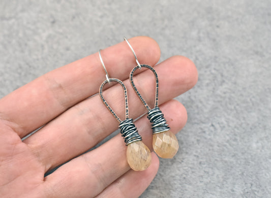 Rutilated Quartz Teardrop Earrings, Mixed Metal Yellow Stone Dangles
