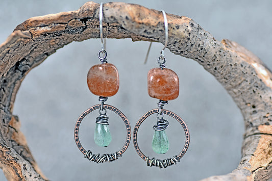 Sunstone, Green Chalcedony, Mixed Metal Earrings, Copper Sterling Silver Rustic Orange Gemstone Artisan Jewelry