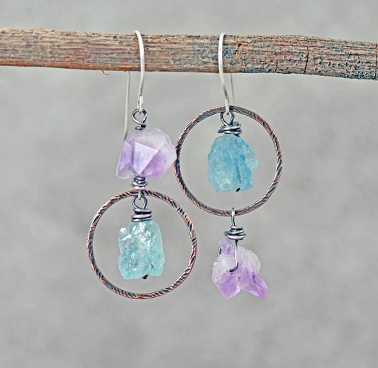 Raw Apatite and Amethyst Asymmetrical Mixed Metal Earrings, Rustic Copper Blue and Purple Circle Jewelry