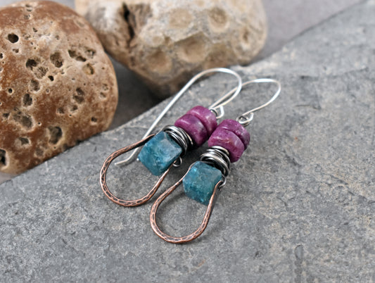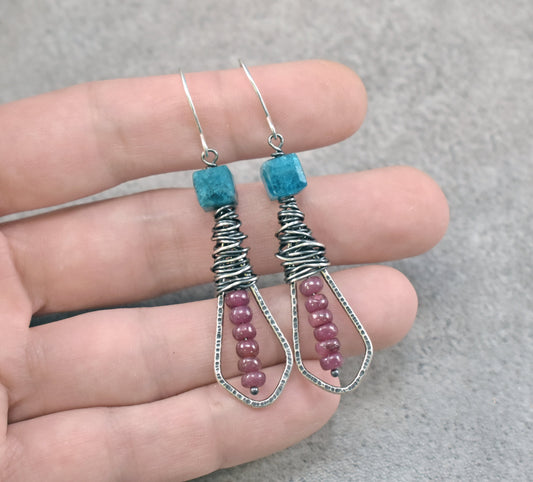 Apatite and Ruby Earrings, Rustic Sterling Silver Gemstone Dangles, Blue and Pink Stones, Unique Artisan Wire Jewelry Handmade