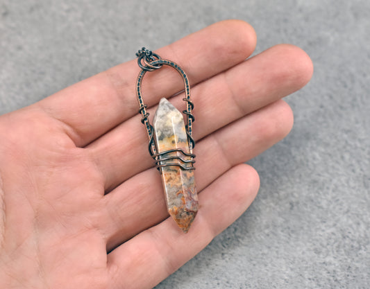 Long Crazy Lace Agate Necklace, Rustic Hammered Copper Wire Pendant
