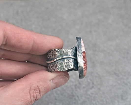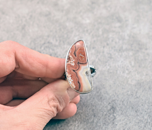 Crazy Lace Agate Wide Band Ring in Sterling Silver, Size 9, Handmade Silversmith Jewelry