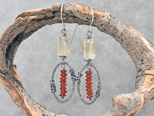 Citrine Carnelian Sterling Silver Earrings, Pale Yellow and Red Oval Dangles, Unique Rustic Gemstone Jewelry