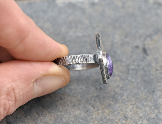 Charoite Ring Size 7, Sterling Silver Unique Purple Gemstone Jewelry, Rustic Texture Artisan Handmade