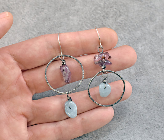 Aquamarine and Super Seven Asymmetrical Sterling Silver Earrings, Blue and Purple Handmade Jewelry