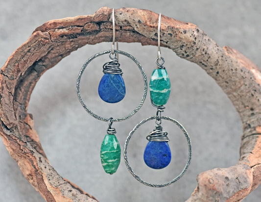 Lapis Lazuli, Amazonite and Sterling Silver Asymmetrical Earrings, Blue Green Stone Artisan Jewelry