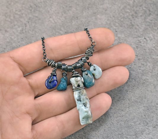 Larimar, Apatite and Lapis Sterling Silver Necklace, One of a Kind Rustic Mixed Gemstone Jewelry