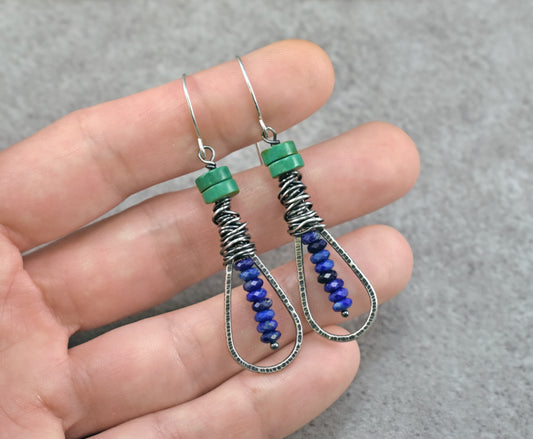 Turquoise, Lapis Lazuli and Sterling Silver Teardrop Earrings, Rustic Boho Jewelry Handmade