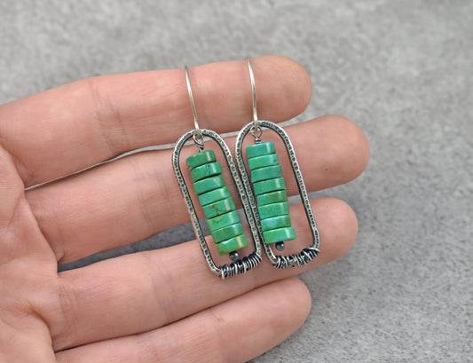 Turquoise Sterling Silver Earrings, Rustic Boho Jewelry Handmade, Unique Green Gemstone Dangles