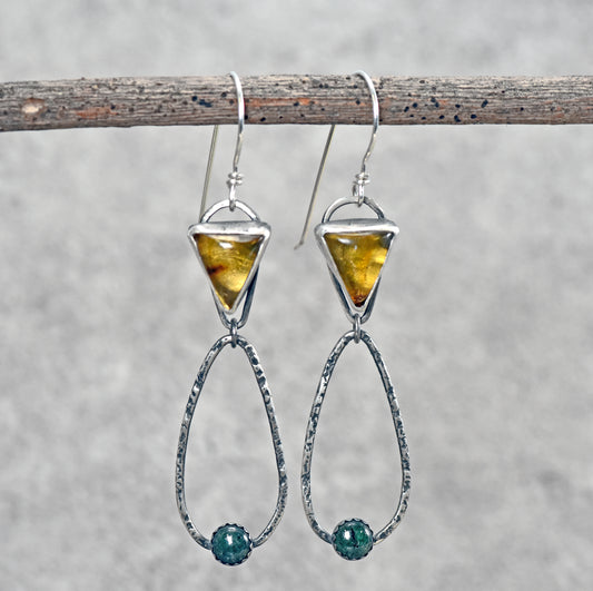 Long Amber and Aventurine Sterling Silver Teardrop Dangle Earrings