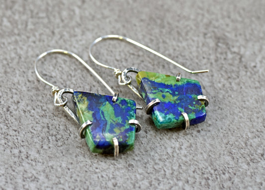 Azurite Malachite Sterling Silver Prong Set Dangle Earrings