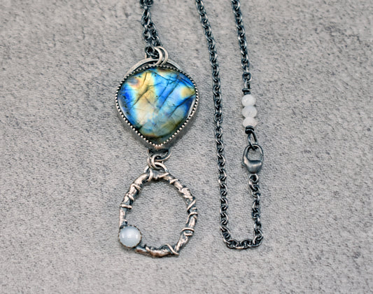 Labradorite, Moonstone and Sterling Silver Necklace, Rustic Silversmith Pendant, Artisan Handmade Jewelry
