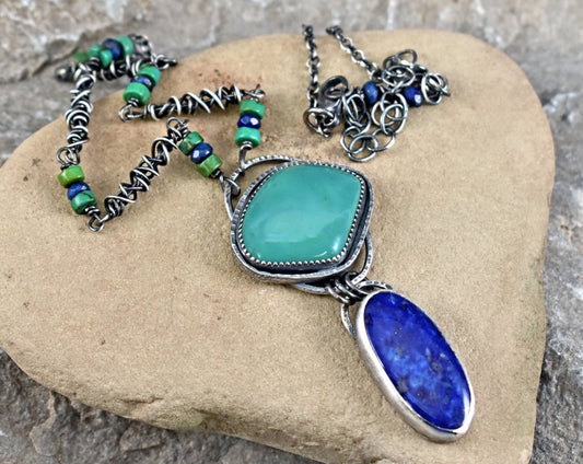 Turquoise Lapis Lazuli Necklace, Oxidized Sterling Silver Pendant, Organic Rustic Silversmith Boho Style Jewelry, Blue Green Gemstone