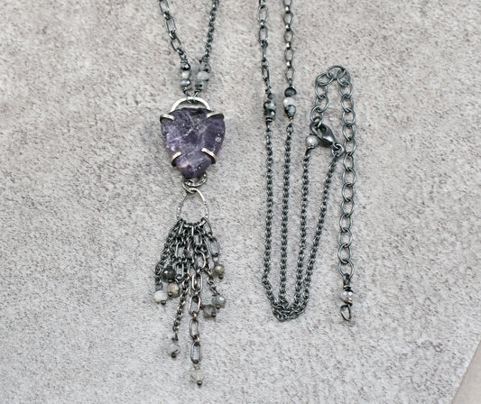 Raw Amethyst and Sterling Silver Prong Necklace, Artisan Purple Stone Pendant with Long Chain