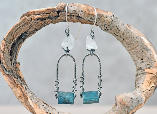 Raw Apatite and Quartz Earrings, Rustic Sterling Silver Rough Gemstone Dangles, Unique Artisan Crystal Wire Jewelry Handmade