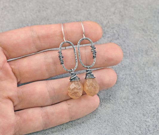 Golden Rutilated Quartz Teardrop Earrings, Yellow Gemstone, Rustic Sterling Silver Wire Dangles