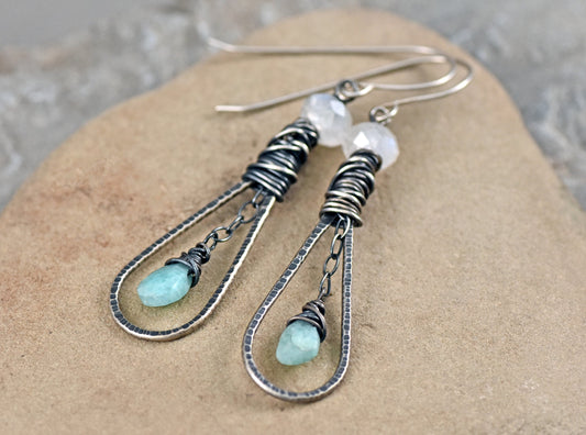 Moonstone Amazonite Sterling Silver Earrings, Light Blue White Gemstone Dangles, Rustic Artisan Wire Teardrop Jewelry Handmade