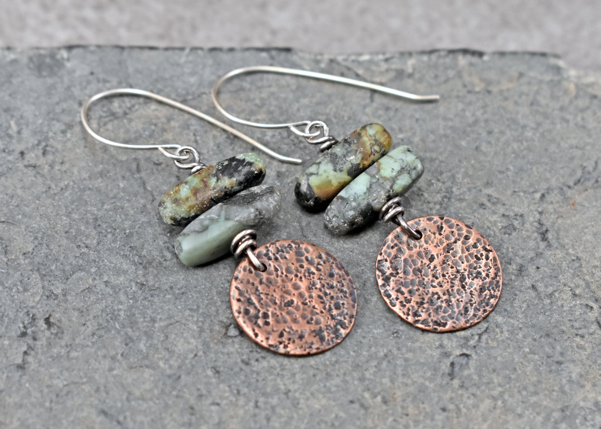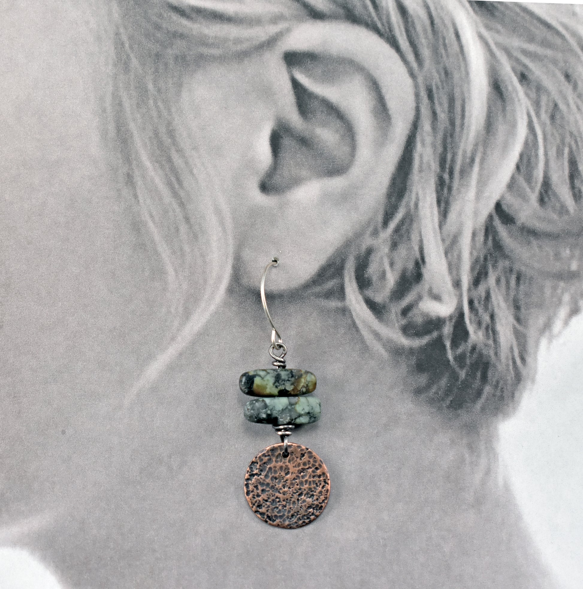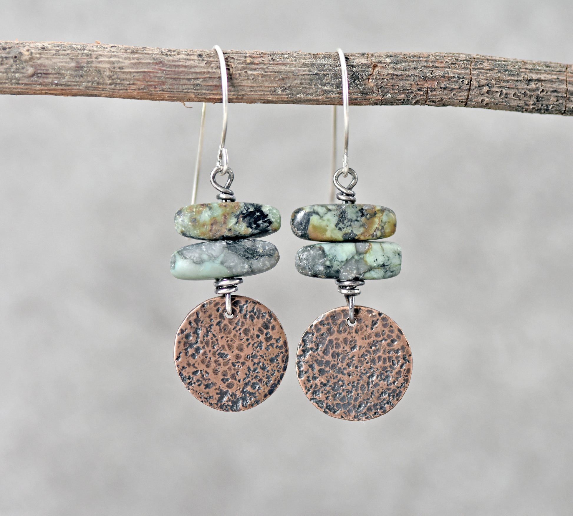 These rustic dangle earrings feature beautiful African turquoise stones. African turquoise is actually a type of jasper named for it's visual similarity to turquoise. Below the stones hang hand-forged, heavily textured copper discs.