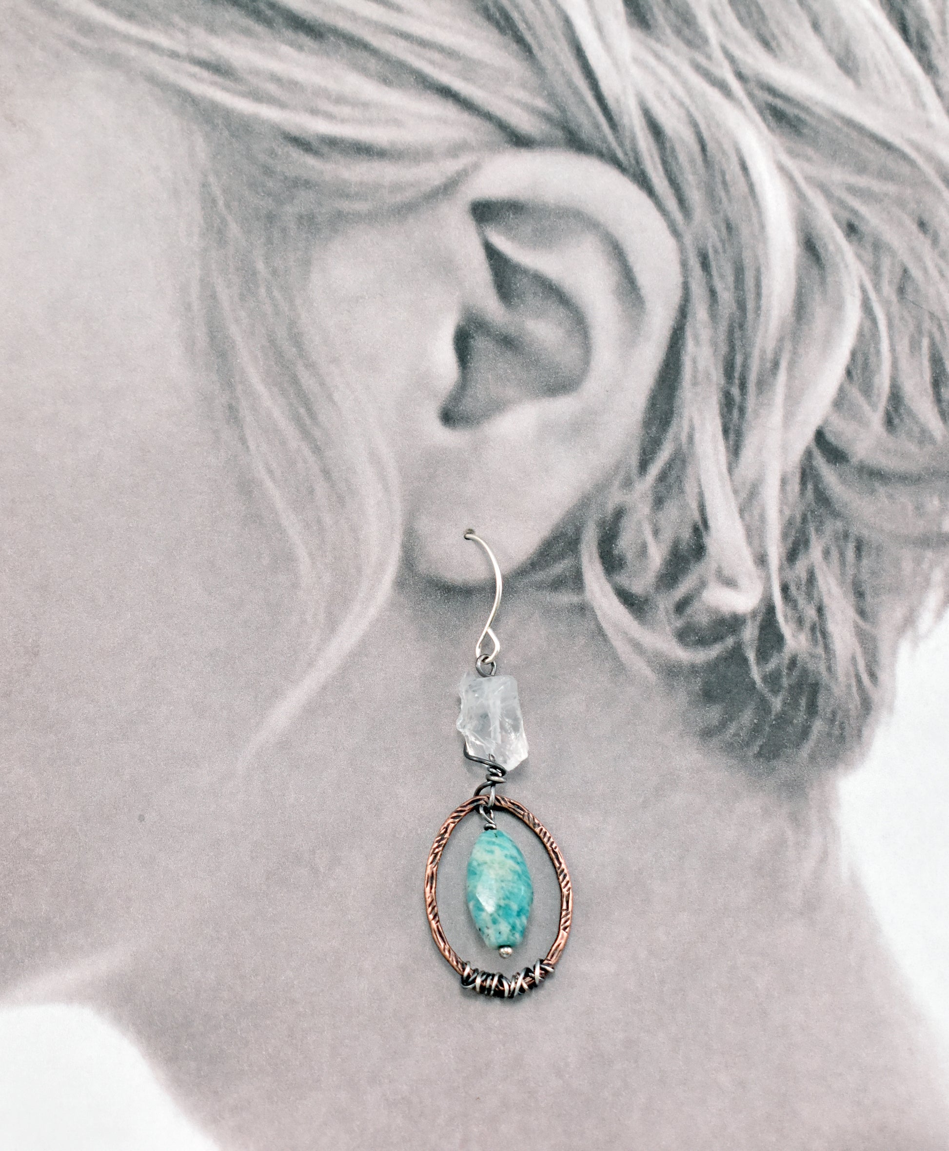 These mixed metal dangle earrings are made with lovely green amazonite, raw quartz and hand-forged copper wire, accented with oxidized sterling silver wire. They hang from handmade sterling silver ear wires.