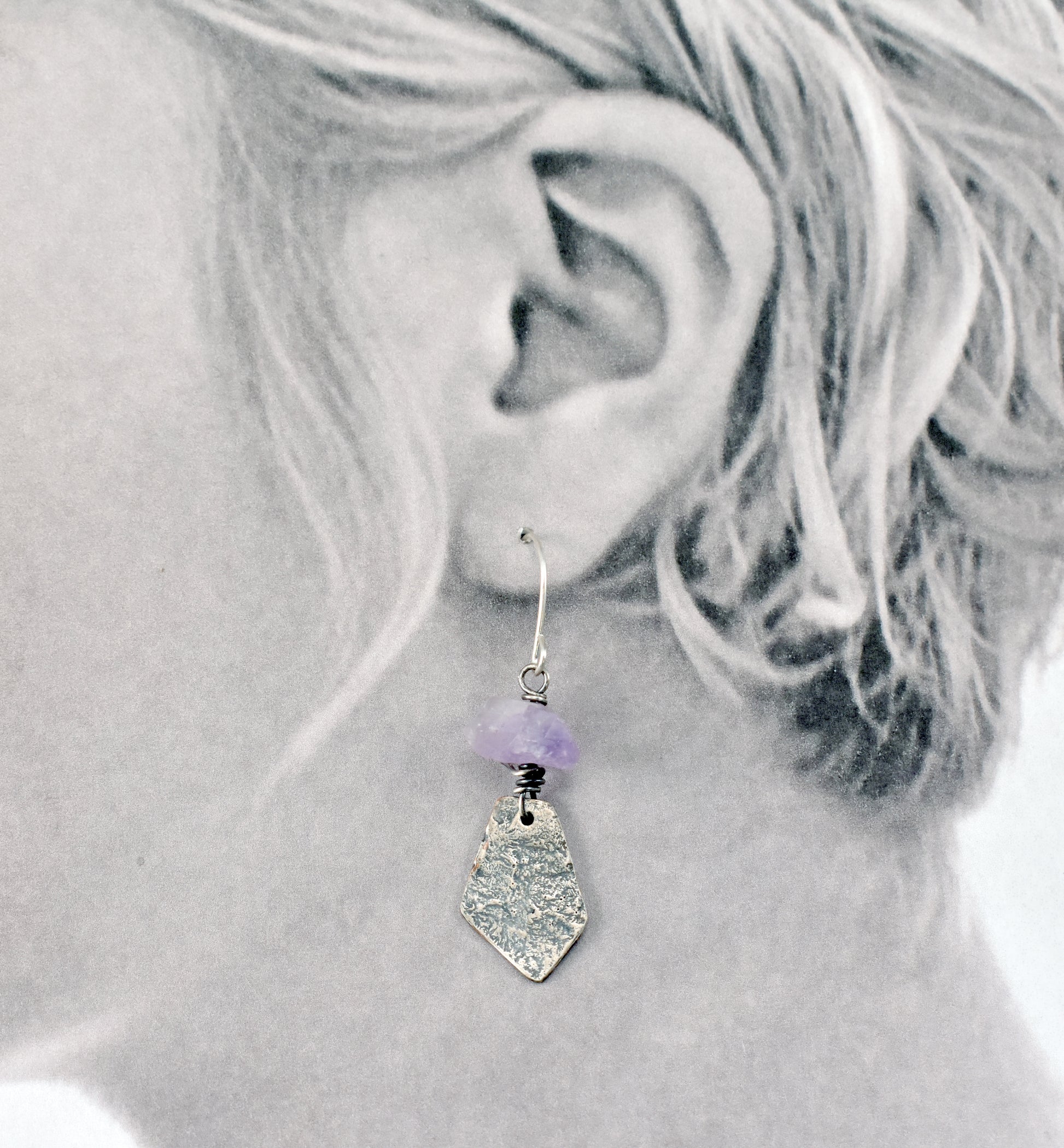 These rustic earrings are made with beautiful raw amethyst stones, copper sheet and oxidized sterling silver wire. The copper has melted sterling silver on top, adding a unique texture to the metal.