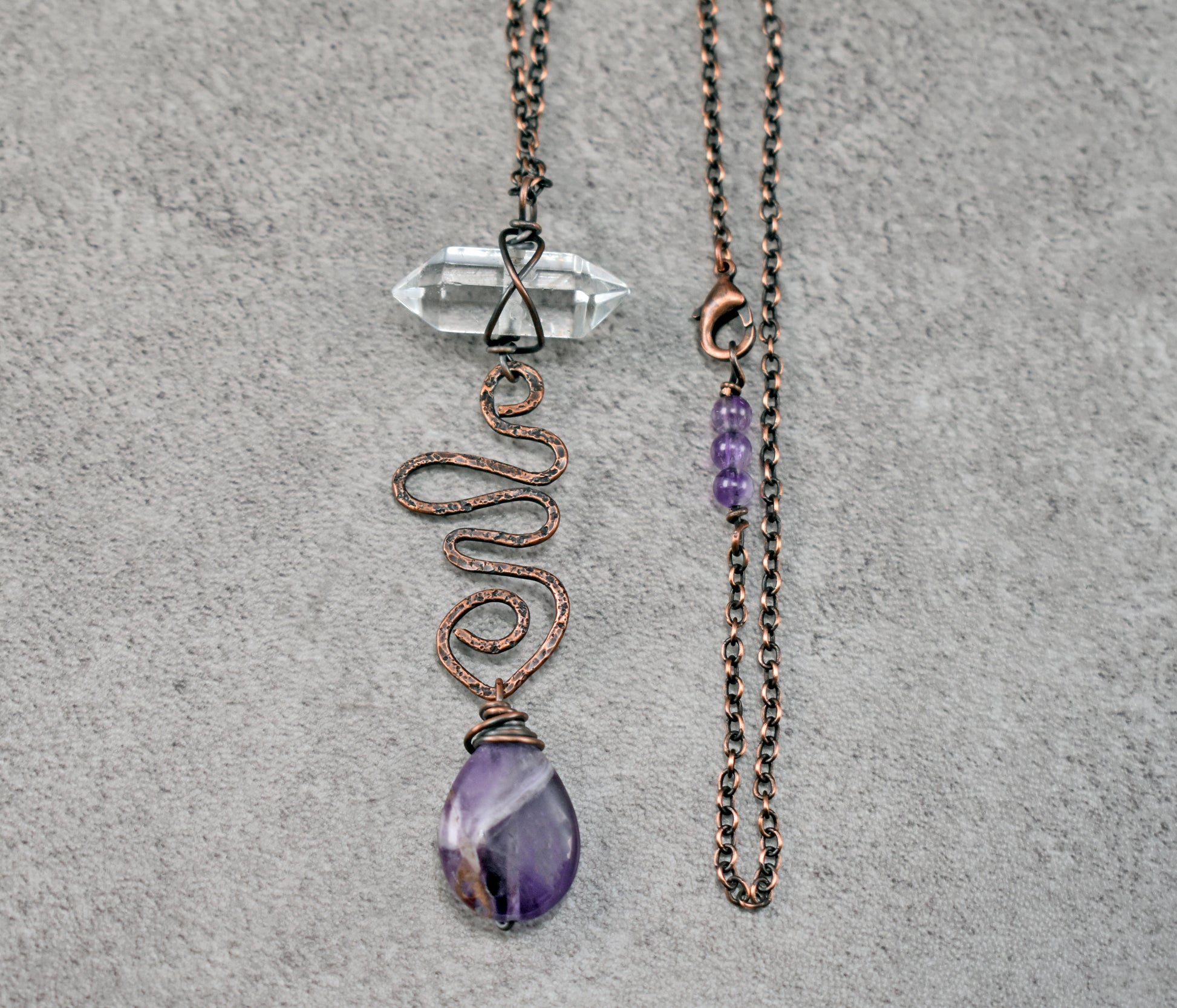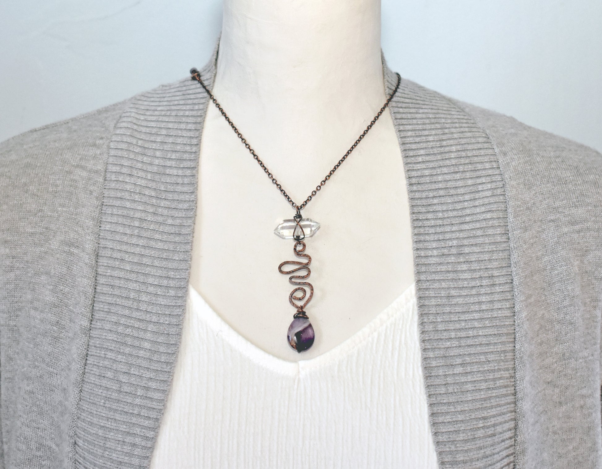 This rustic necklace features a natural amethyst teardrop bead, a double terminated quartz point bead and hammered copper wire.