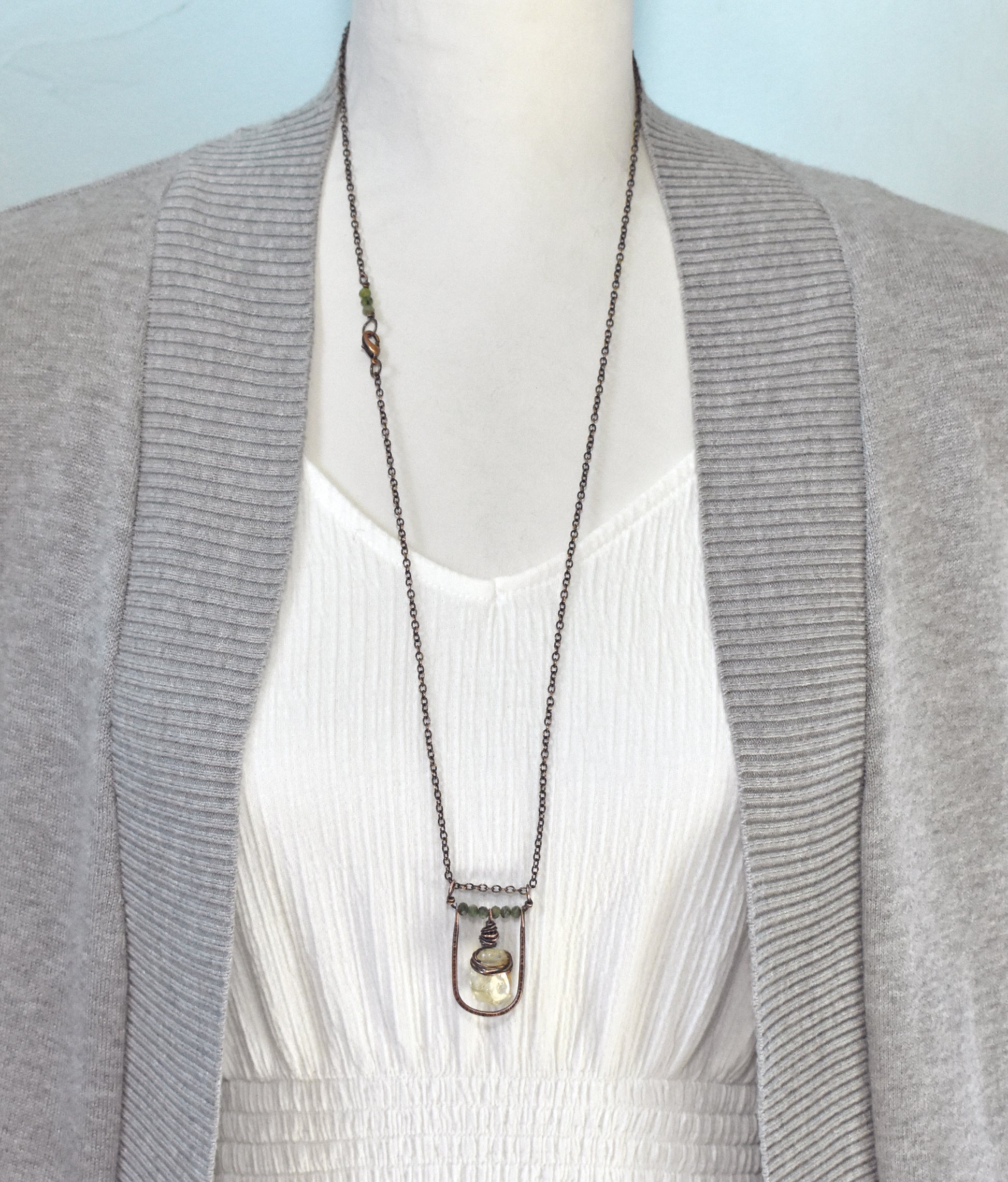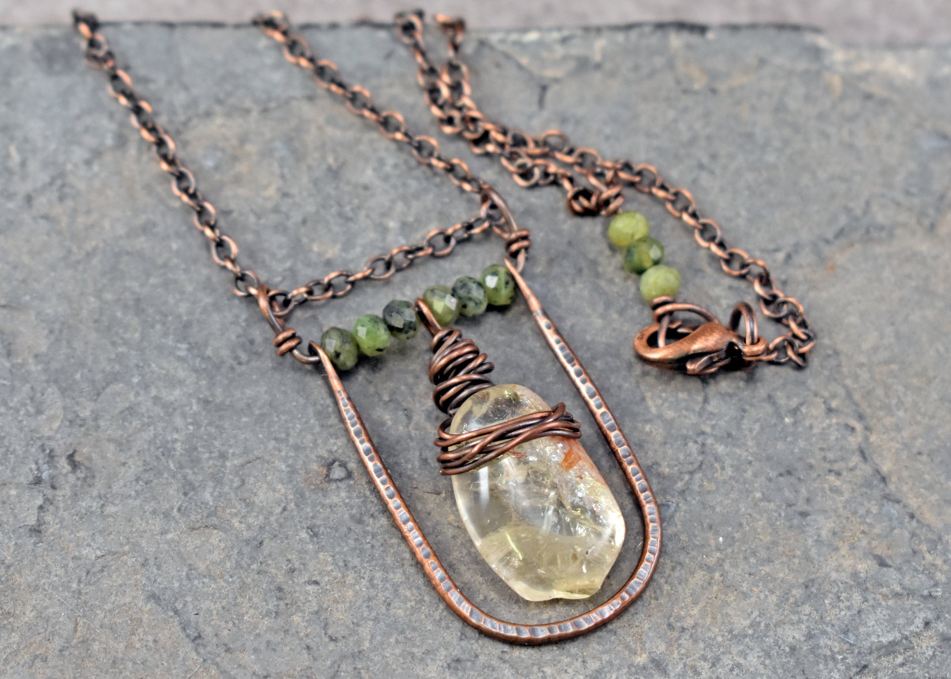Citrine, Jade and Copper Necklace, Natural Yellow and Green Stone Pendant, Unique Handmade Jewelry