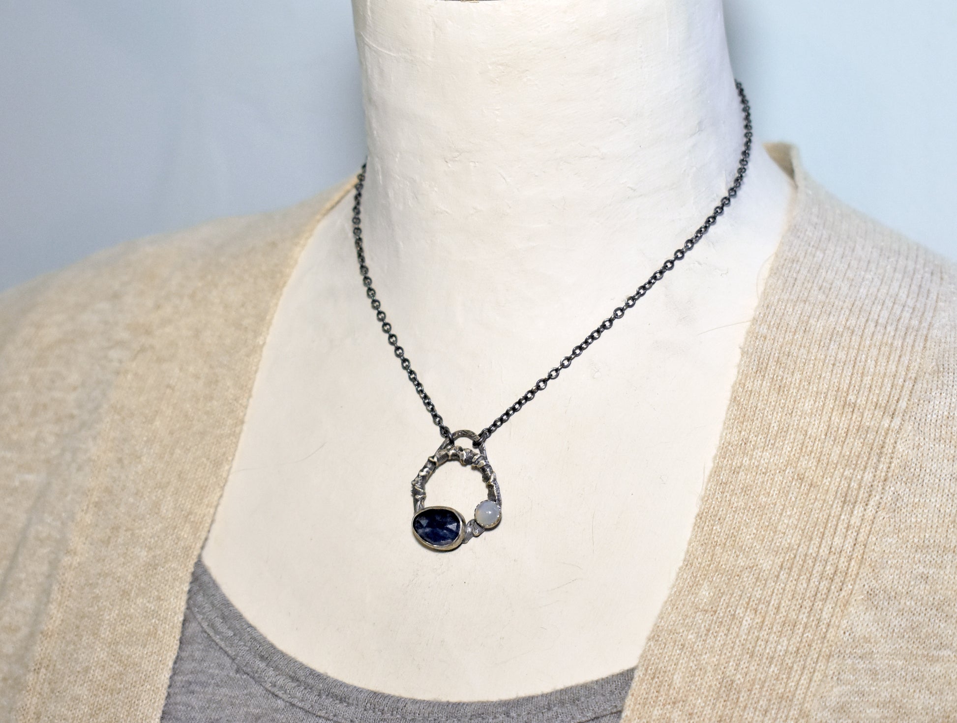 This rustic, mixed gemstone necklace features a blue faceted sapphire and small moonstone in a hand fabricated setting of fine and sterling silver.