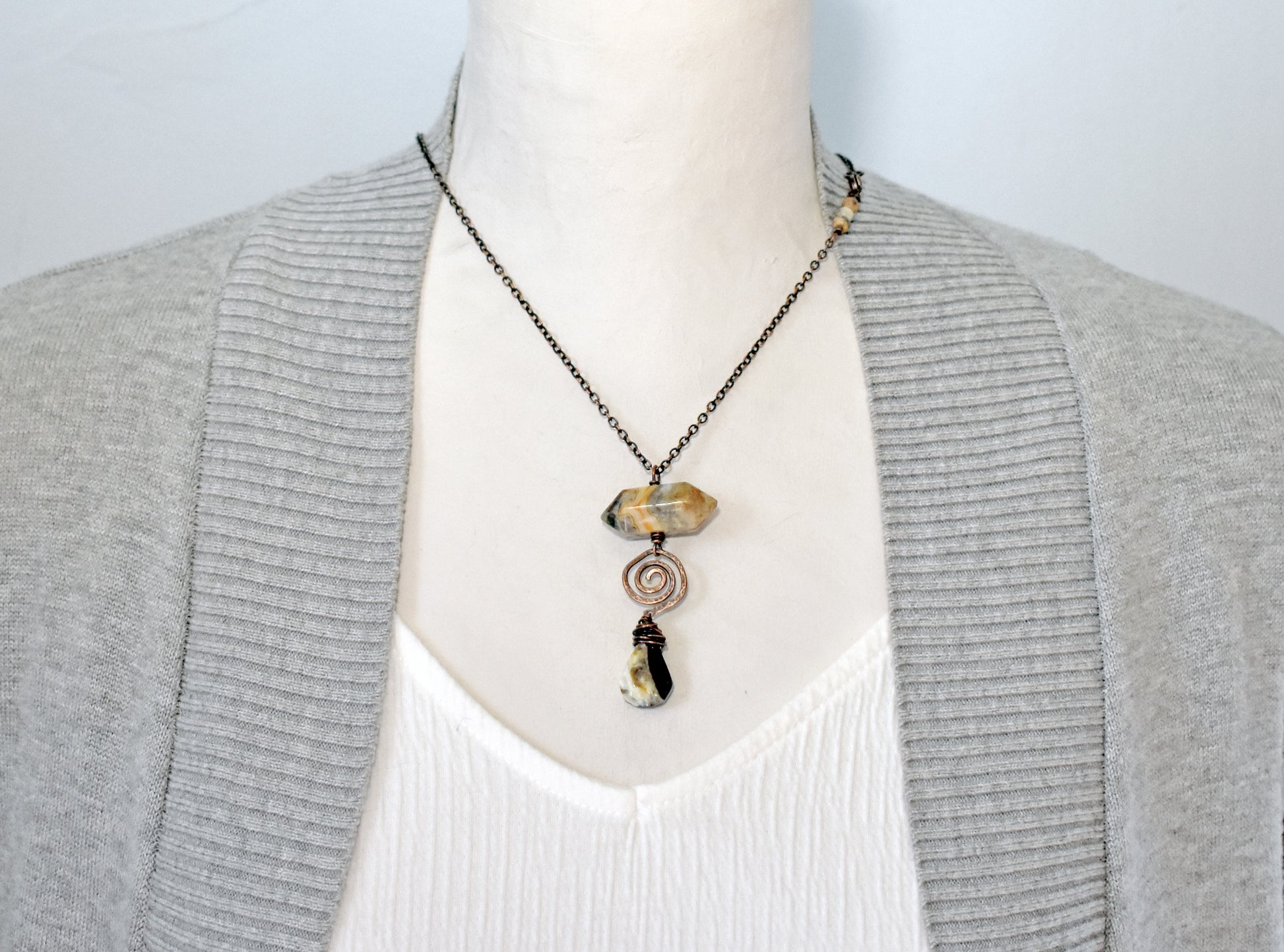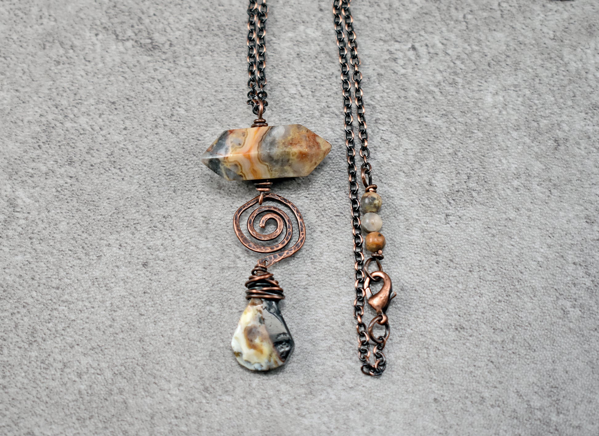 This rustic statement necklace features a double terminated crazy lace agate point bead, a rutilated quartz teardrop and hammered copper wire. The oxidized copper chain closes with a copper-plated lobster clasp, accented with more agate beads.