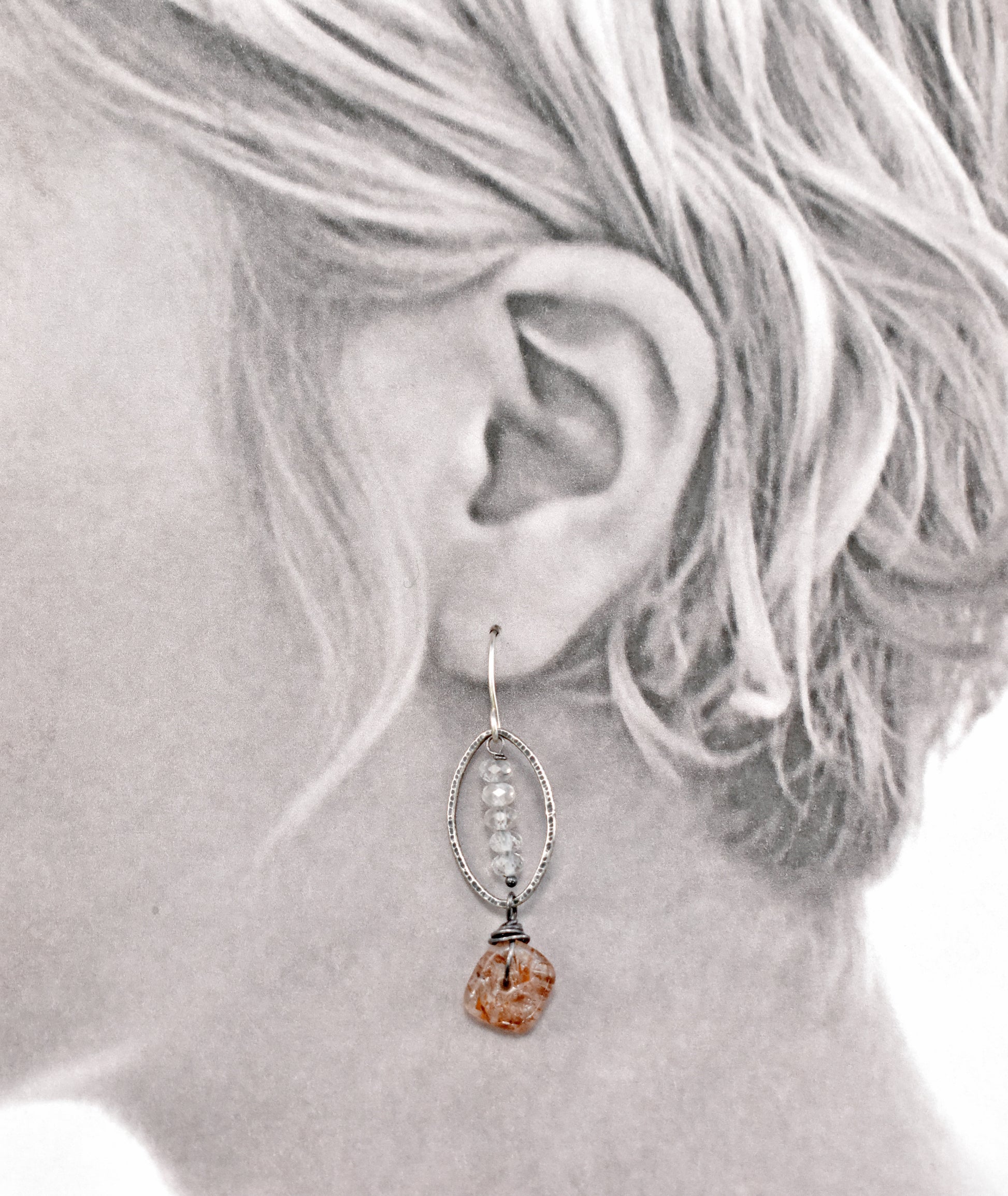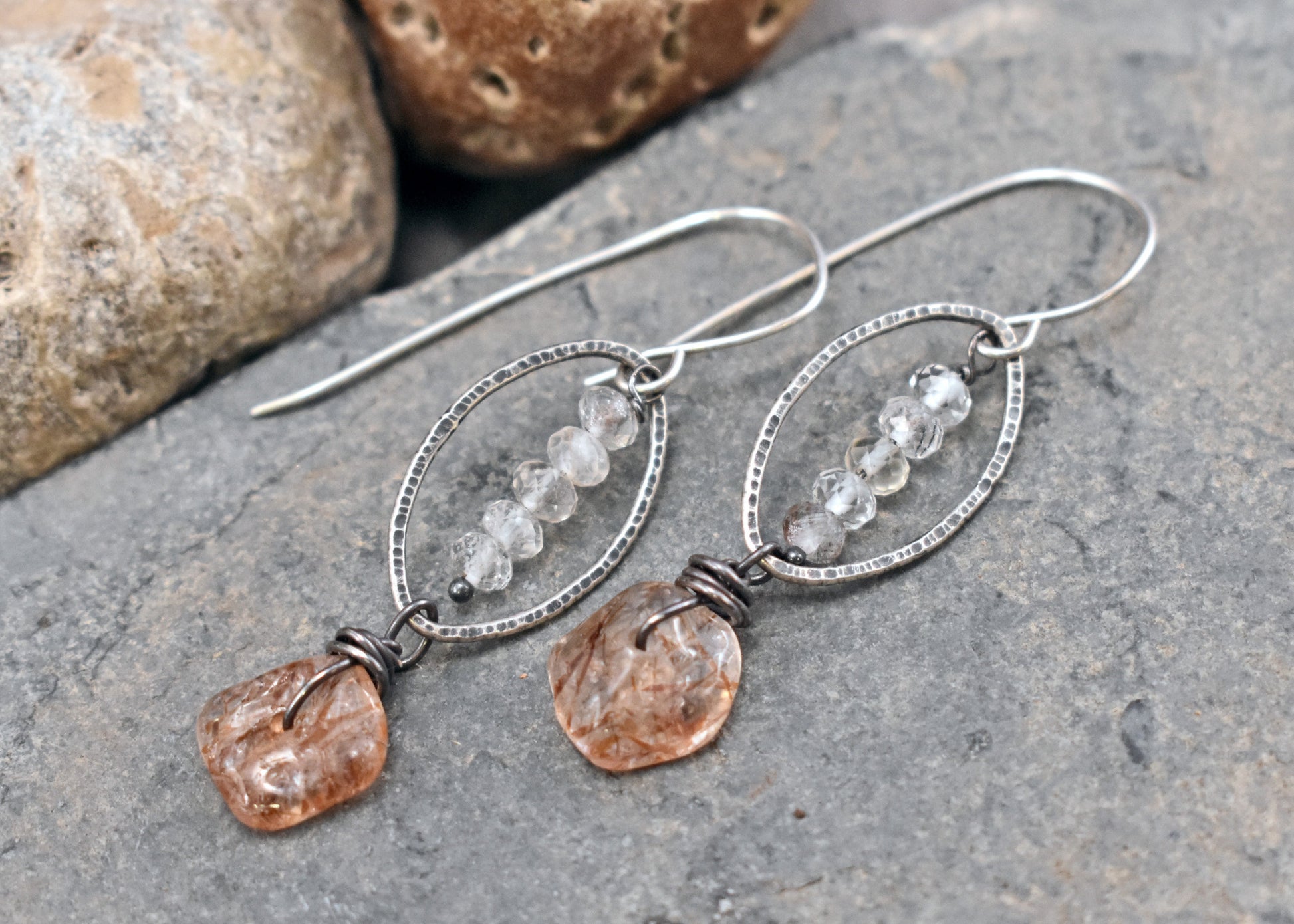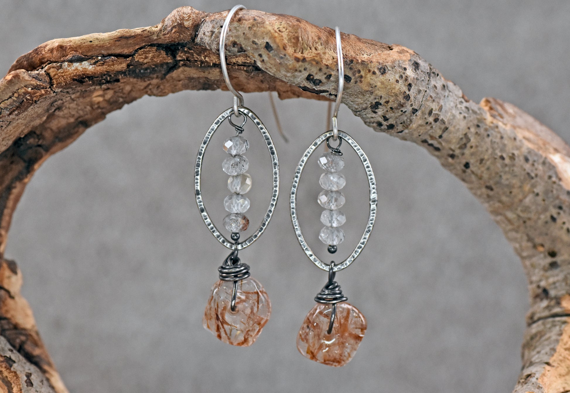 These rustic dangle earrings are made with lovely faceted quartz, red rutile quartz beads and oxidized sterling silver wire. They hang from handmade sterling silver ear wires.