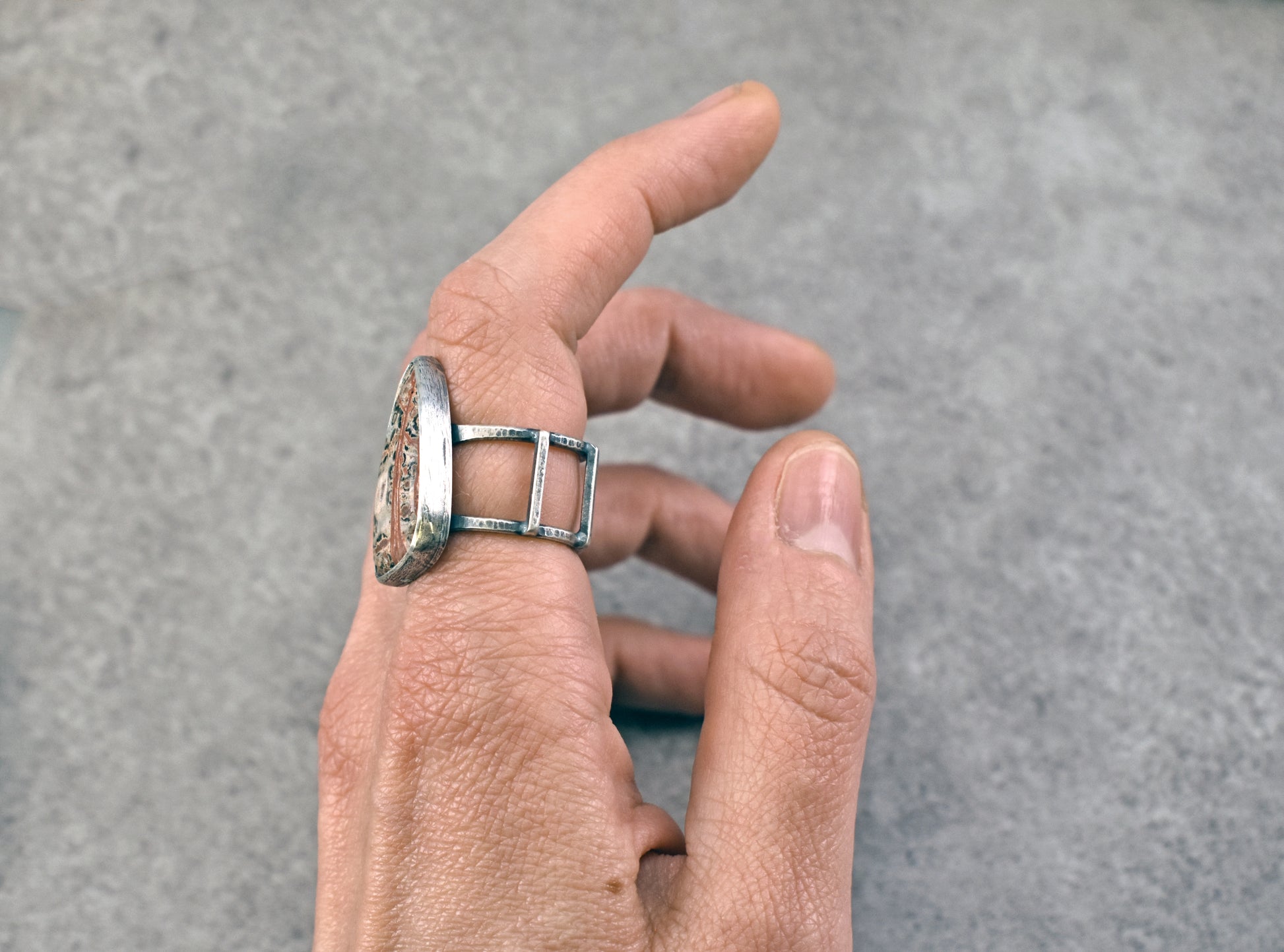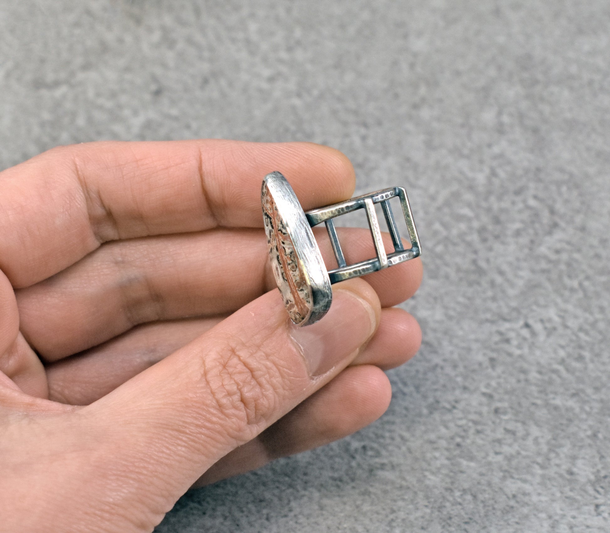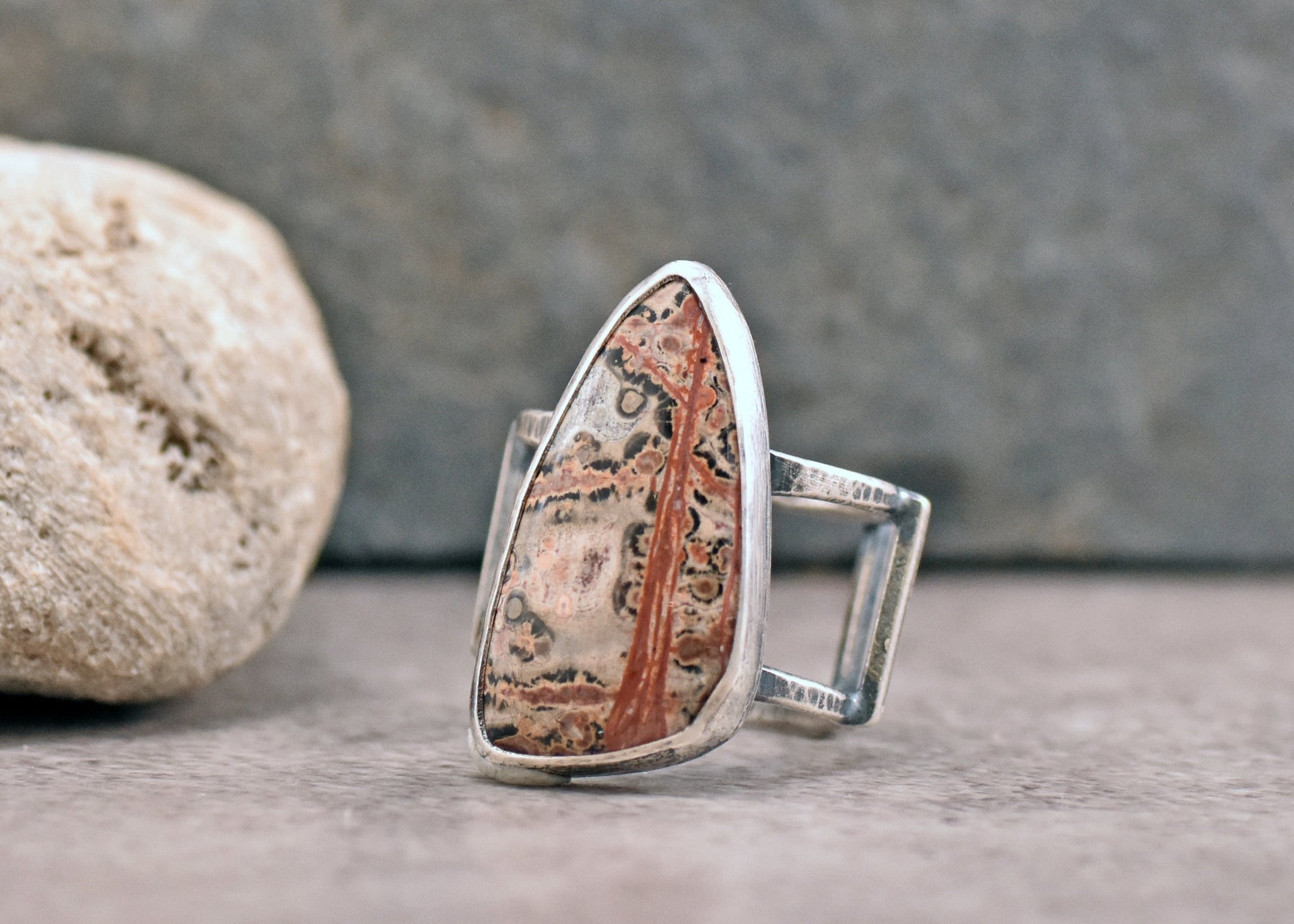 This rustic statement ring features beautiful leopard jasper stone in a handmade setting of fine and sterling silver. The stone is 1 inch tall and the ring has a wide band design.