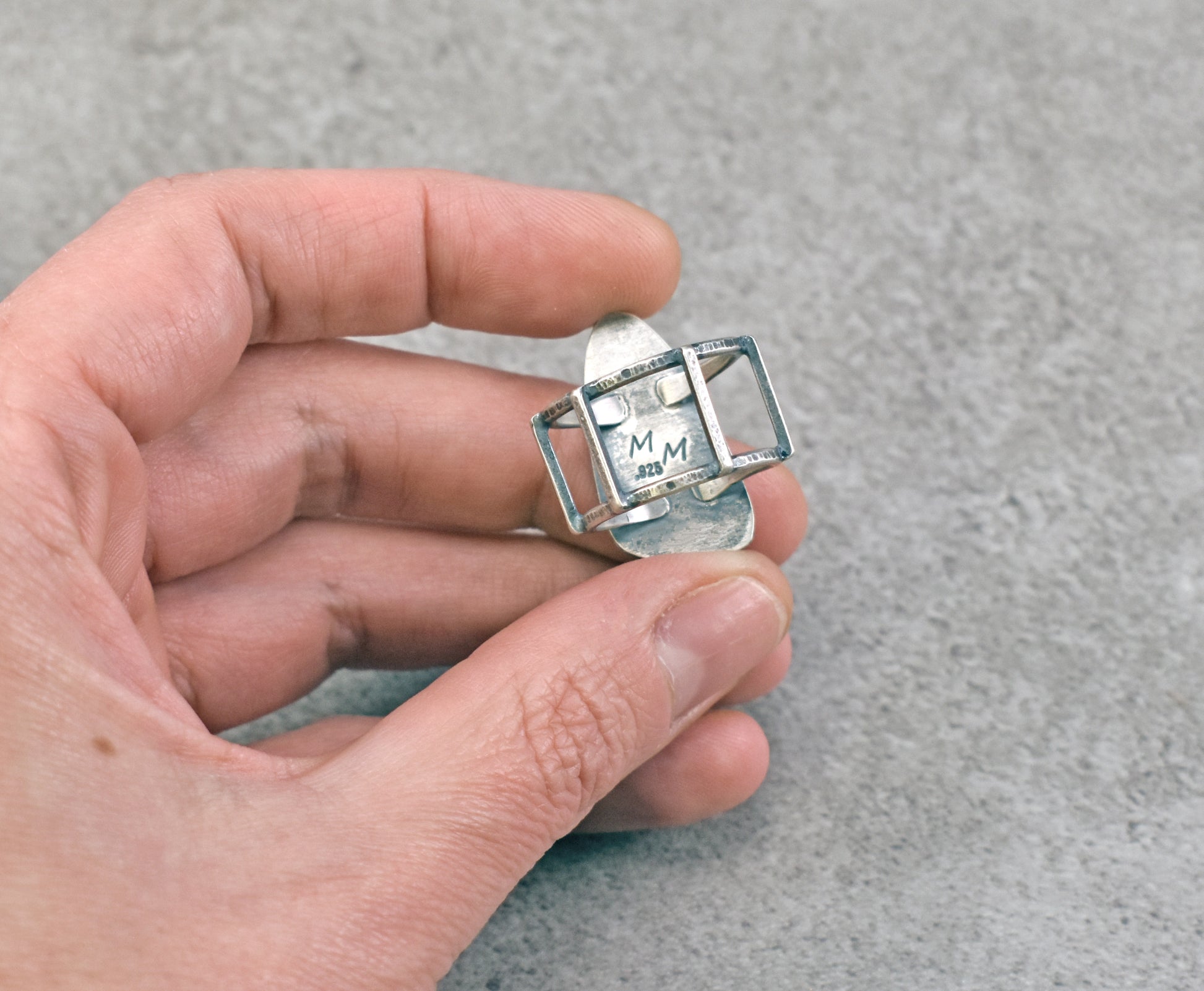 The band has been hand-textured, then oxidized and polished. My maker's mark (initials) and .925 for sterling silver are stamped on the back of the stone.