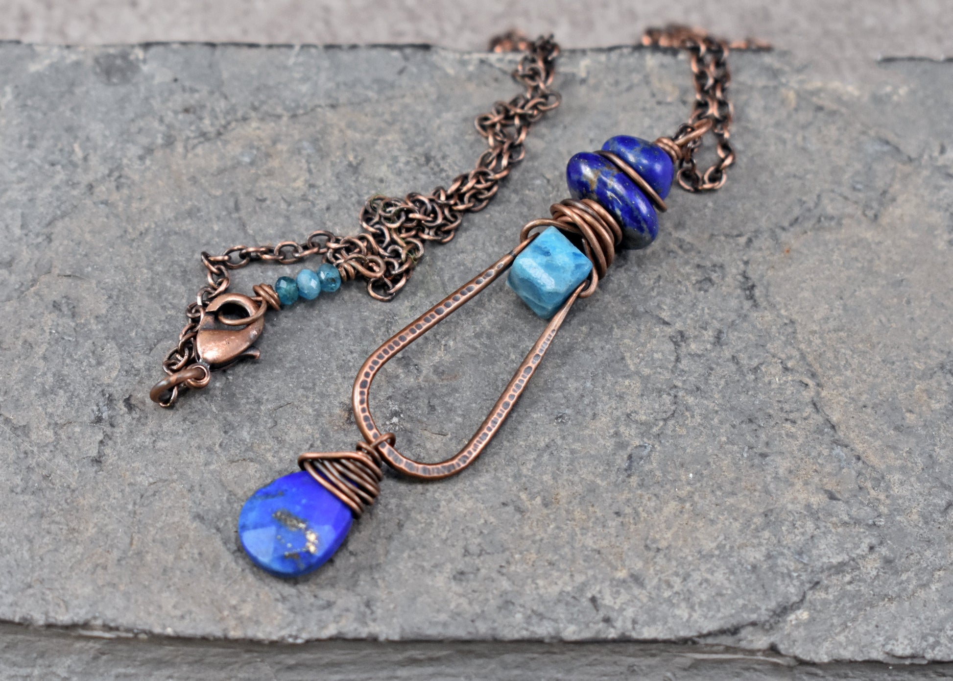 This rustic necklace features lovely lapis lazuli and apatite beads, hammered copper wire and oxidized copper chain.