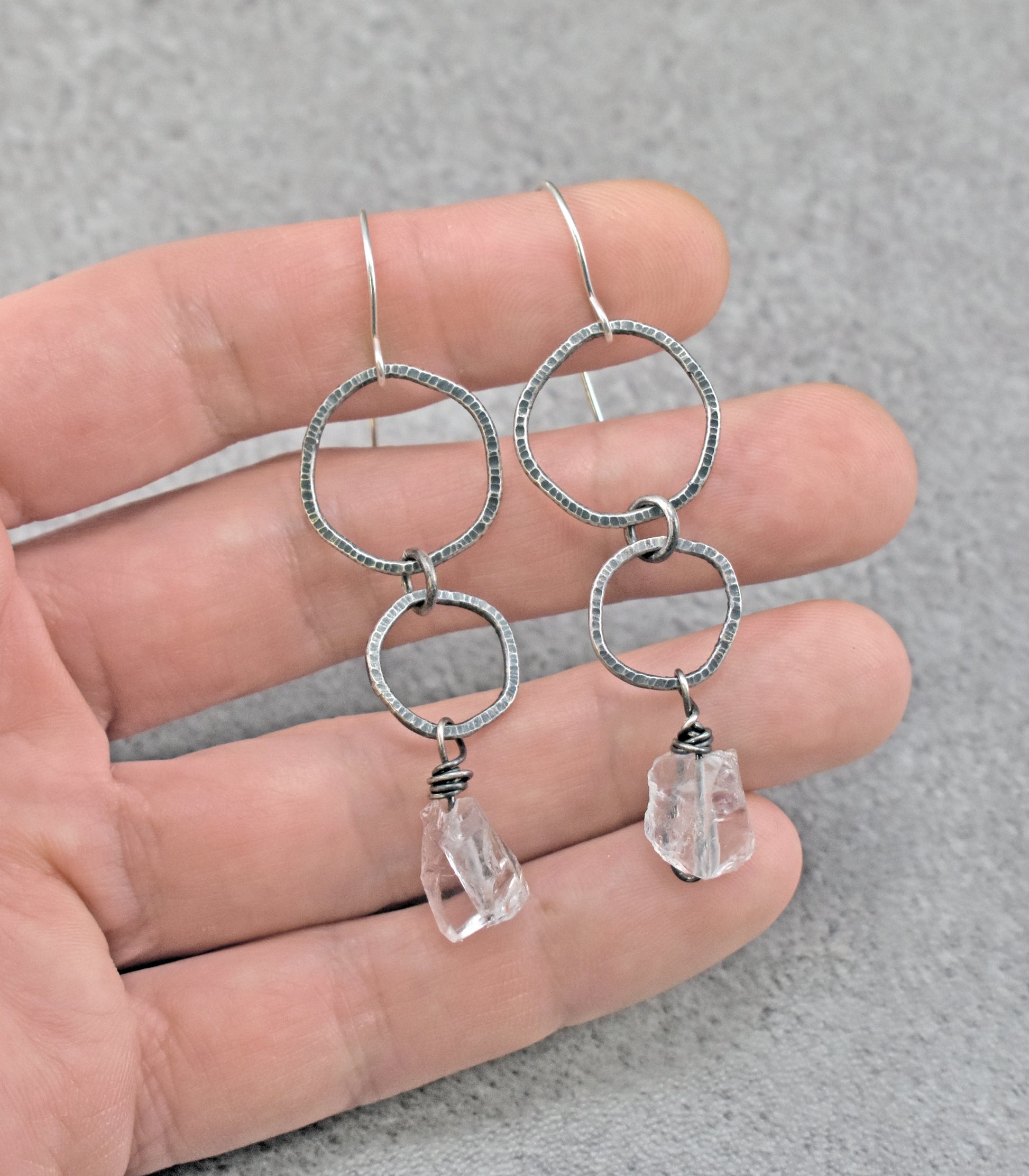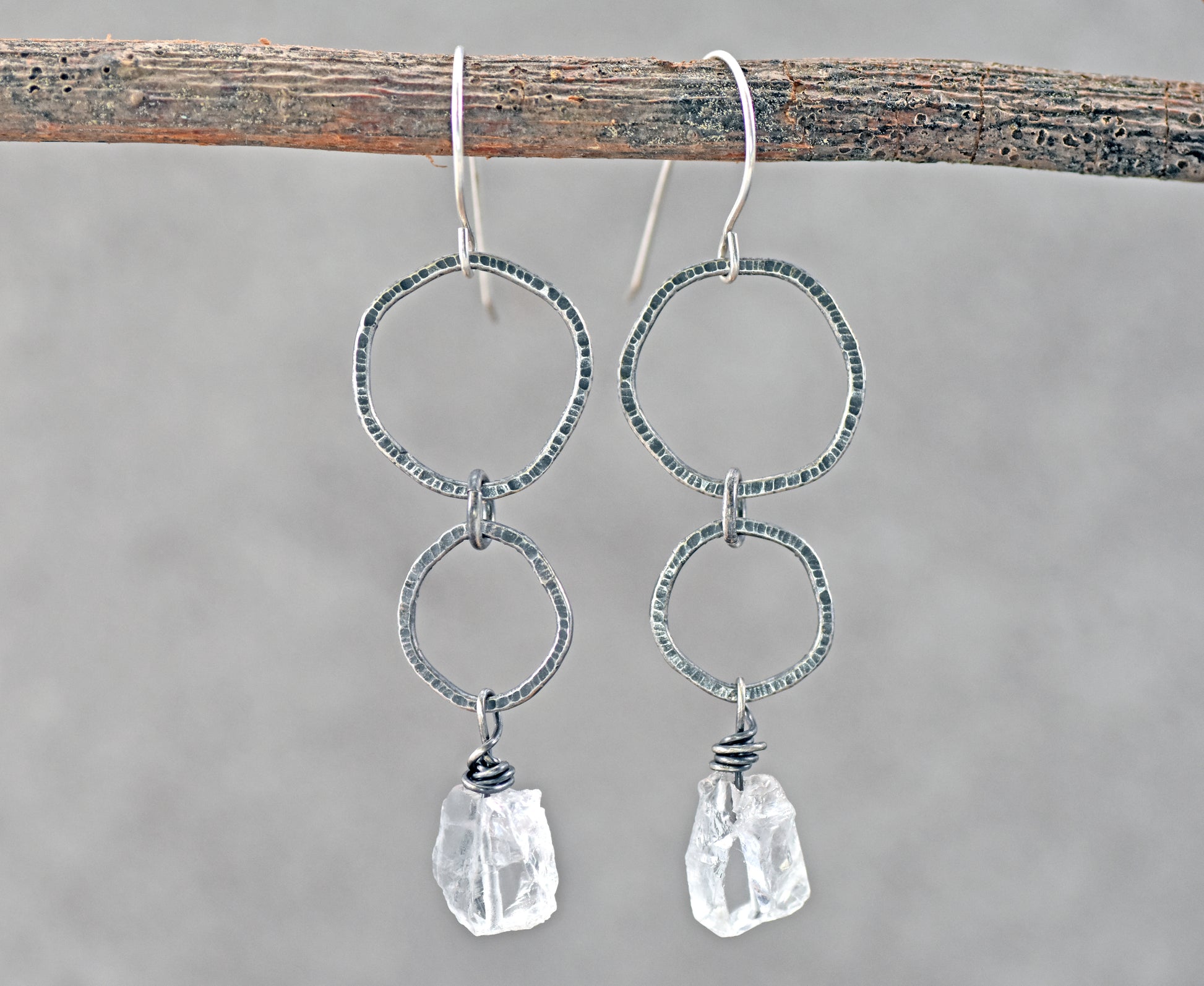 These rustic dangle earrings are made with lovely raw quartz stones and hand-fabricated sterling silver wire circles. They hang from handmade sterling silver ear wires.